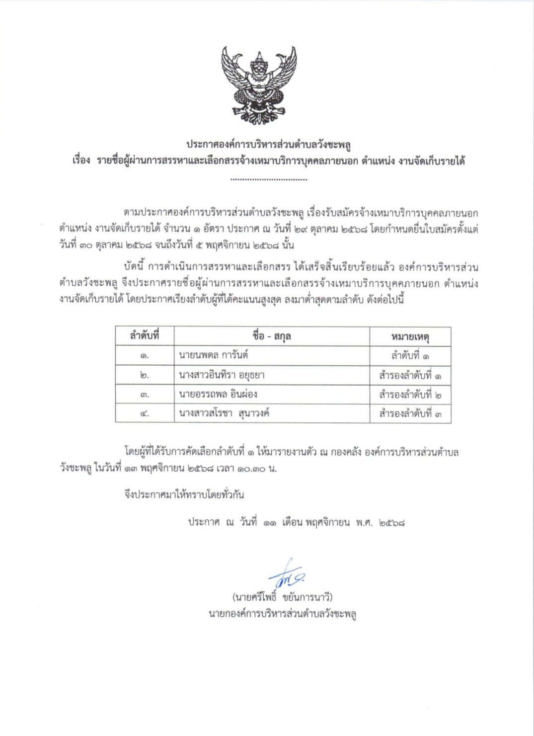 ประกาศองค์การบริหารส่วนตำบลวังชะพลู เรื่อง รายชื่อผู้ผ่านการสรรหาและเลือกสรรจ้างเหมาบริการบุคคลภายนอก ตำแหน่ง งานจัดเก็บรายได้