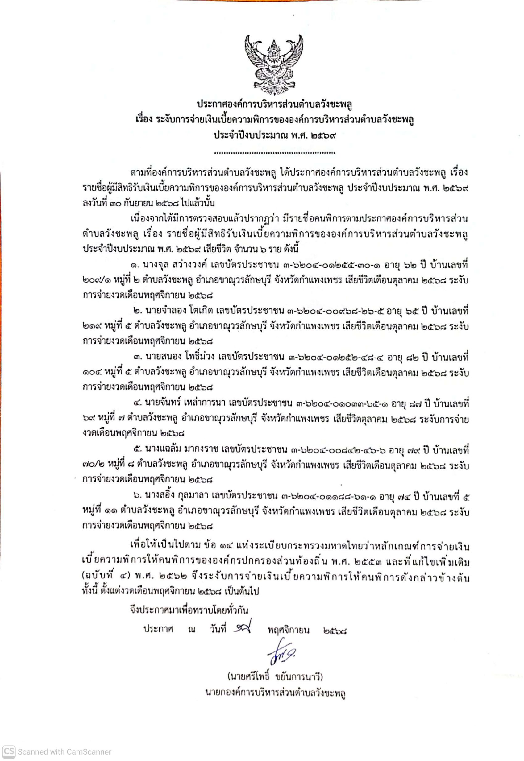 ชื่อเรื่อง : ประกาศองค์การบริหารส่วนตำบลวังชะพลู เรื่อง ระงับการจ่ายเงินเบี้ยความพิการขององค์การบริหารส่วนตำบลวังชะพลู ประจำปีงบประมาณ พ.ศ. 2569